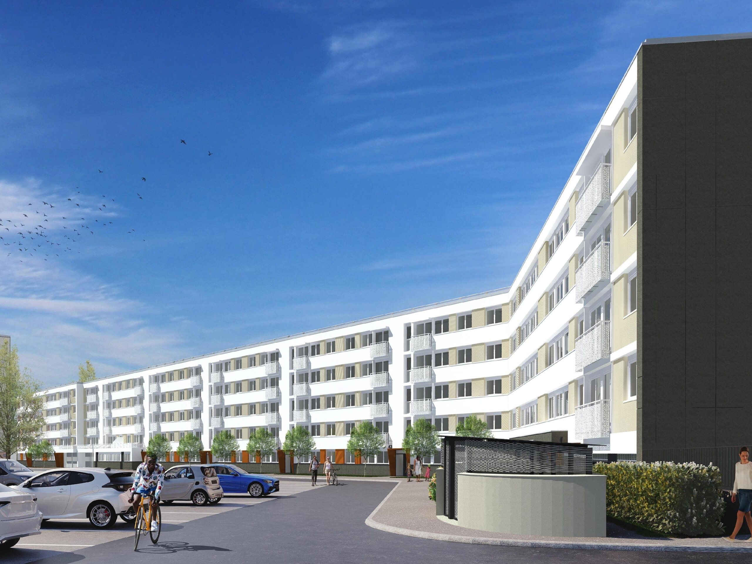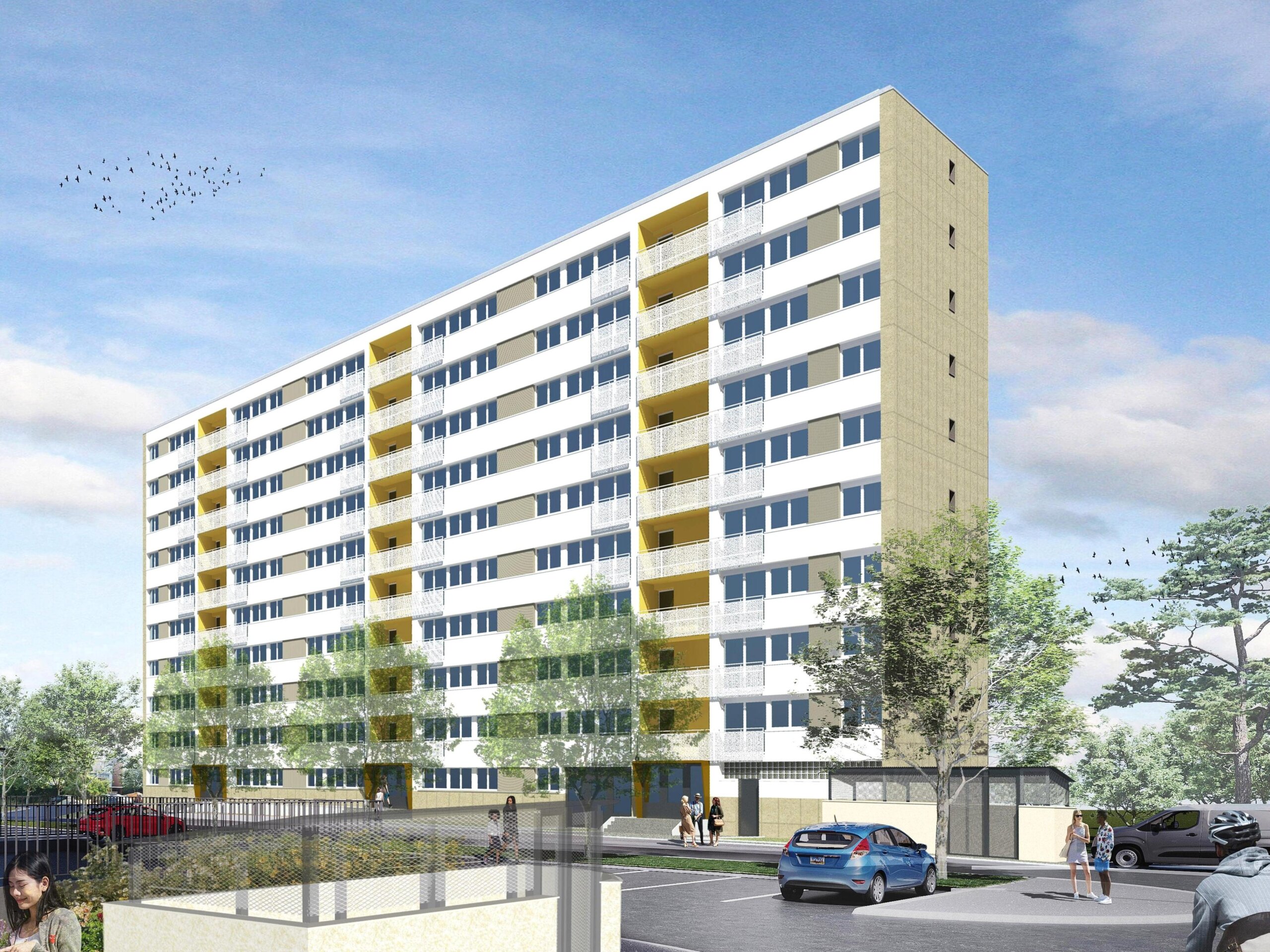 – La rénovation thermique de l’enveloppe des bâtiments : remplacement de l’isolation thermique des façades, renouvellement des menuiseries extérieures et des occultations, installation de nouveaux des garde-corps en métal perforés colorés et création de petits balcons sur les façades Sud des bâtiments F, L et S.